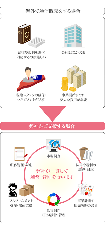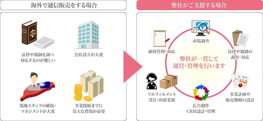 中国・ASEAN諸国に商品を展開するために必要な商品企画・広告制作・コールセンターから物流までをトータルにサポート。